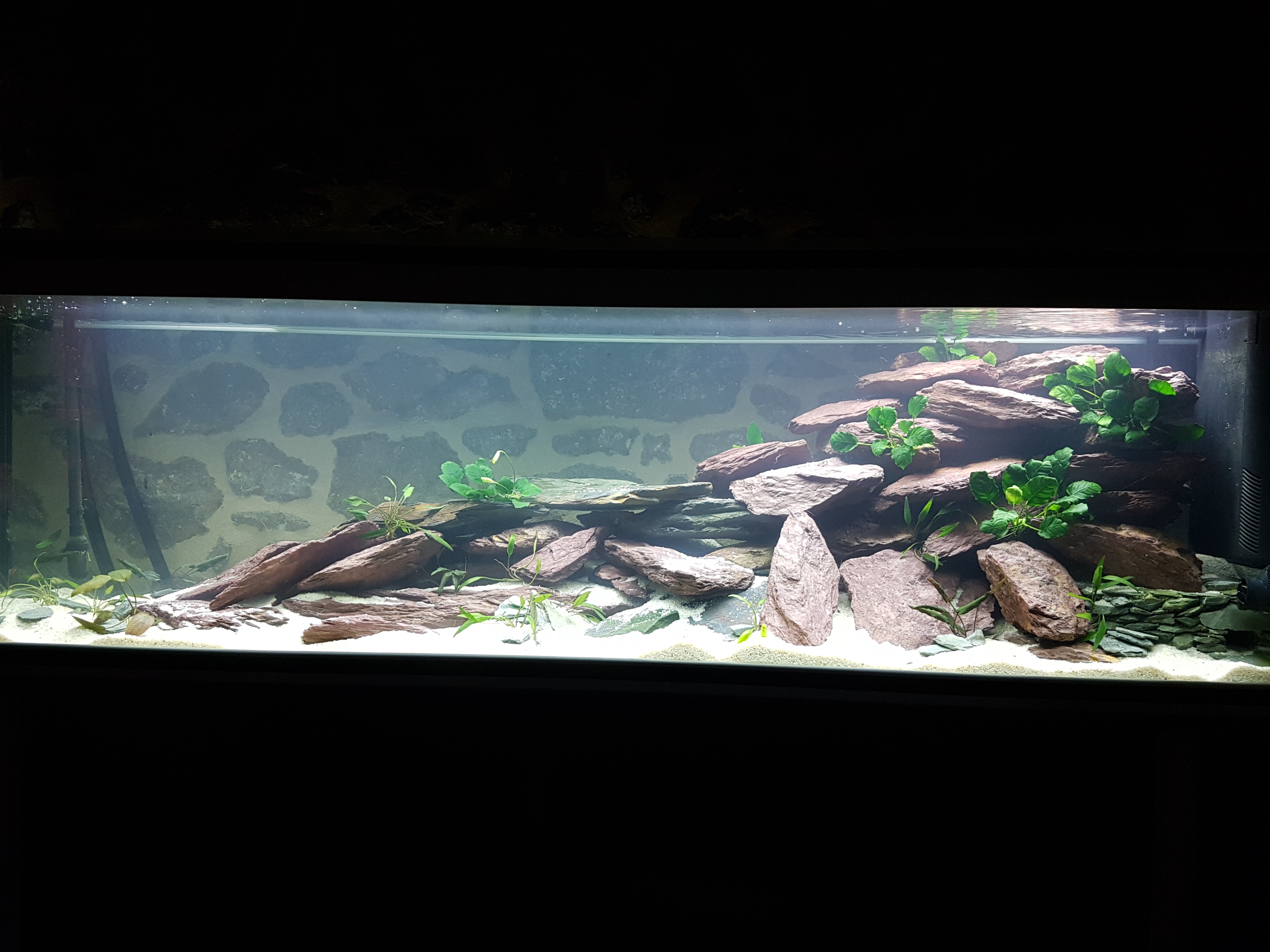 Sur la face arrière de l'aquarium, pas de poster, le mur est en de pierres derrière l’aquarium, il devrait coller avec le rendu du bac. Je compte, quand même, rajouter un film noir sur les parties couvertes par mes pierres, histoires que les poissons aient des cachettes opaques, sans lumière qui passerait par la vitre arrière du bac.